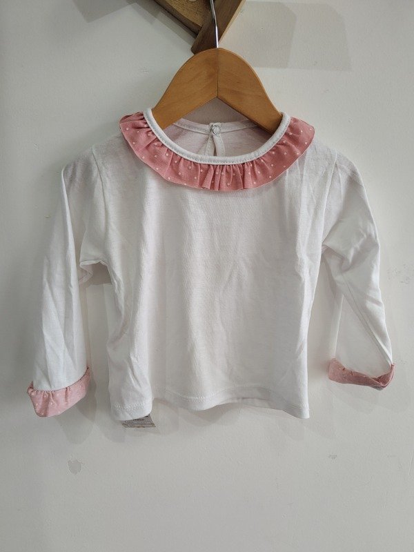 Remera beba algodon blanca, con cuello y puños con volado estampado. TALLE 5